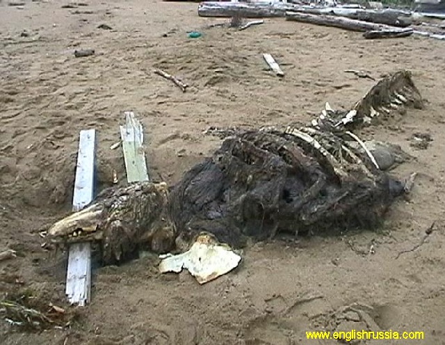 Desafortunadamente las imagenes de los misteriosos restos de Rusia que fueron encontrados en 2006 son muy muy parecidos a la osamenta de la Ballena Beluga cuyo habitat de hecho abarca regiones de rusia, inclusive el asunto de los dientes que parecen molares son similares tambien a los de esta ballenita blanca asi como el tamaño tambien es el idoneo. Por lo que el misterio de esos restos al menos se resolvio.
